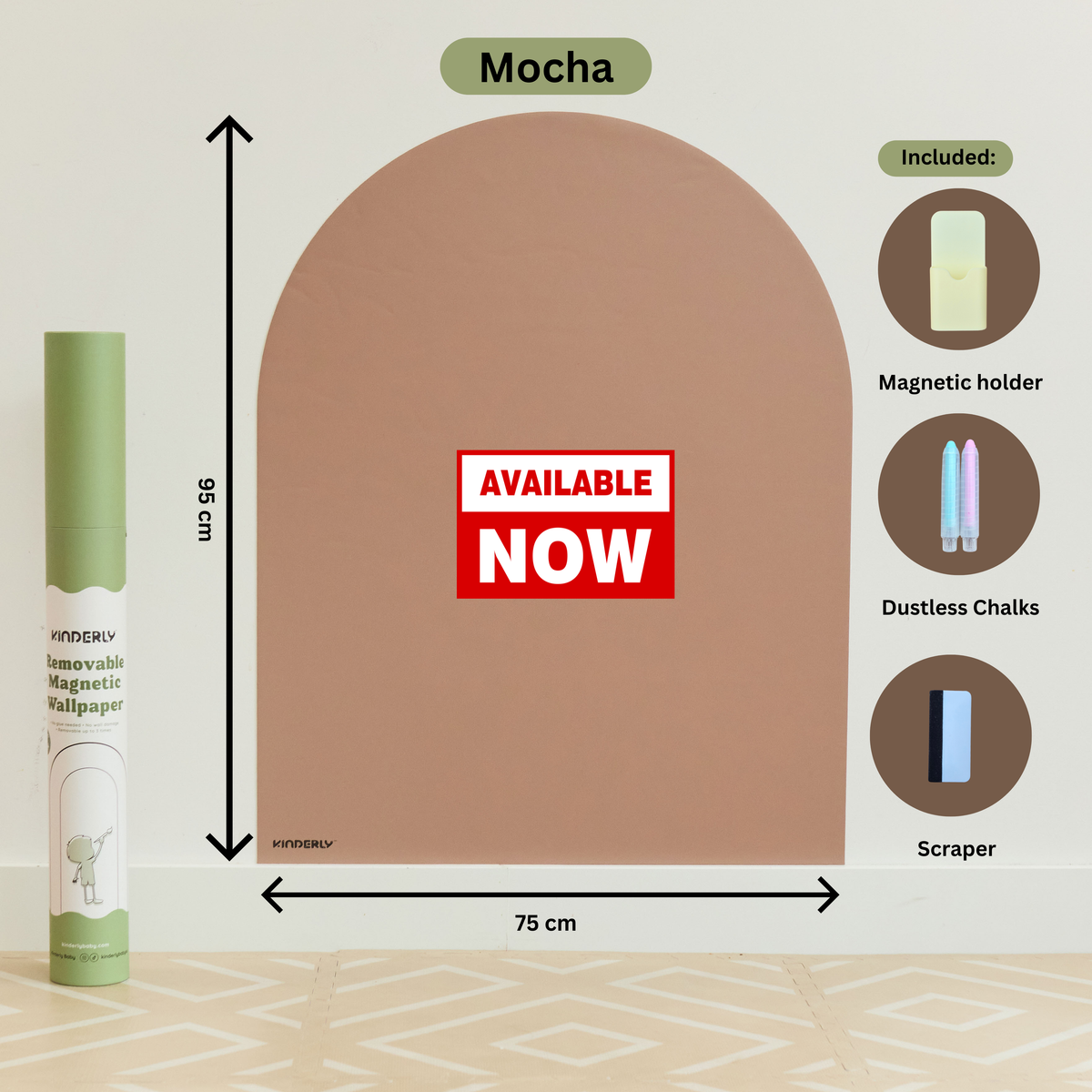 Ons boogvormige, verwijderbare magnetische behang heeft een verbeterde magnetische kracht, een nieuwe stevige verpakking en wordt geleverd met 3 extra accessoires (een magnetische houder, 2 stofvrije krijtjes en een schraper).